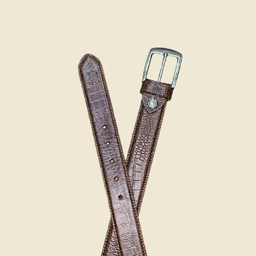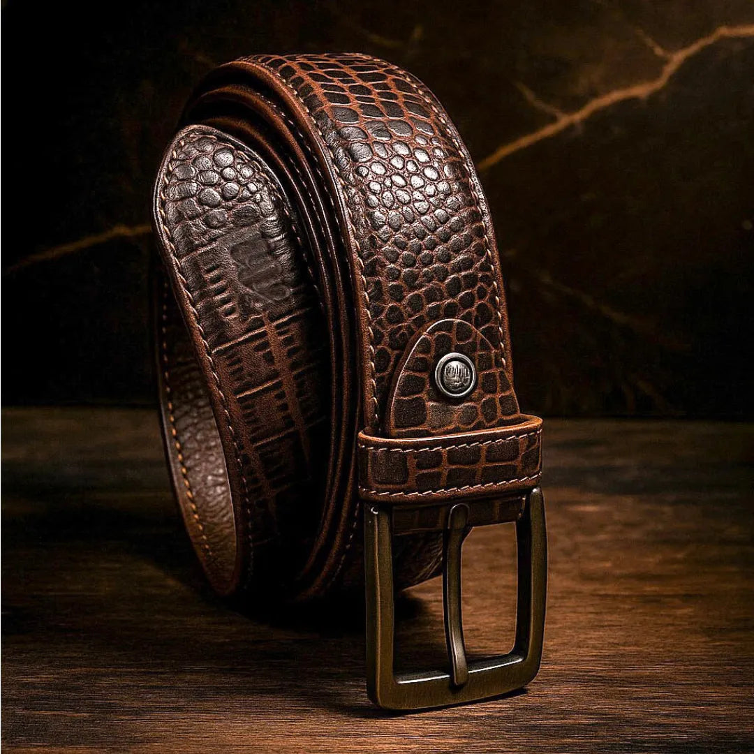 Make a bold statement with this dark brown leather belt featuring a crocodile-textured finish and classic metal buckle. Ideal for casual and semi-formal outfits. Durable, stylish, and unique.