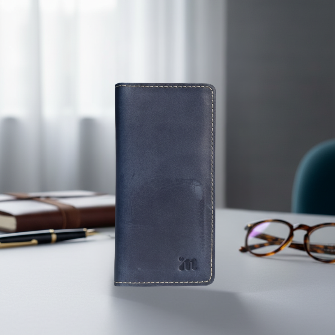 Durable full-grain leather in rich navy tone