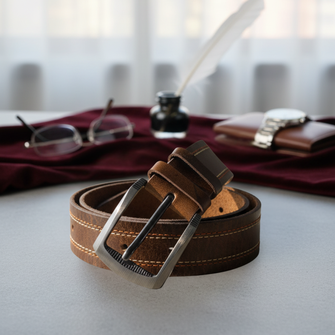 Step into timeless sophistication with The Rugged Elite leather belt. Handcrafted from premium full-grain leather, this belt showcases a rich dark brown finish with bold contrast stitching for a refined yet rugged look. Its sturdy buckle and durable build make it the ideal companion for both everyday wear and special occasions. A true symbol of strength and elegance combined.